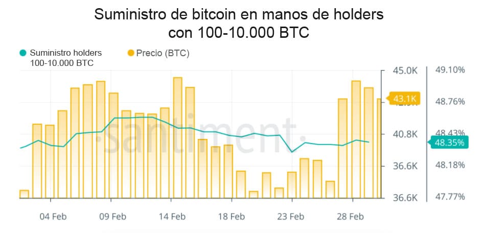 En el gráfico siguiente muestra cómo, desde inicio de febrero, el suministro de controlado por estos holders era moderado y como, en los días subsiguientes, tuvo un declive. No obstante, para estos primeros días del mes de marzo, los BTC en manos de este segmento de holders se ha vuelto a estabilizar con cerca del 48% del suministro bajo su control.