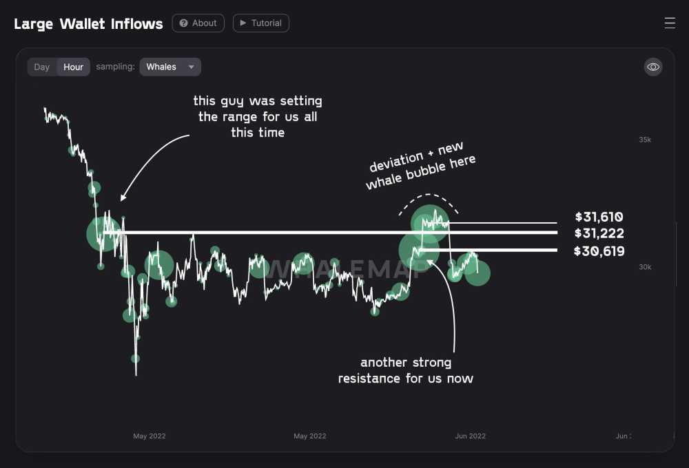 Un volumen suficientemente grande de BTC vendidos puede asociarse a la creación de un nivel de resistencia determinado, como se aprecia en el gráfico. Una sucesión de ventas importantes puede conducir a que el nivel de resistencia baje, como se ve en el gráfico anterior. Whalemap sugiere que el actual nivel de resistencia es de USD 30.619, como producto de una serie de ventas realizadas por una ballena en los últimos días.
