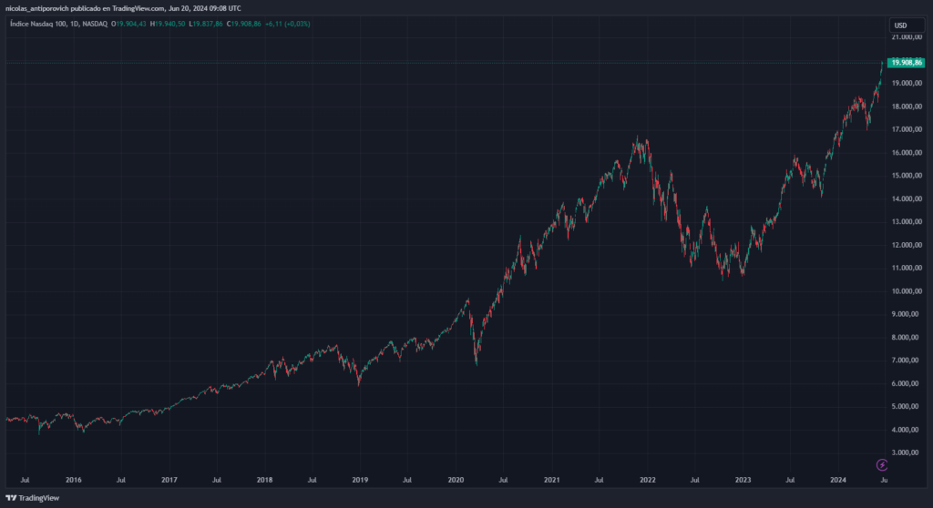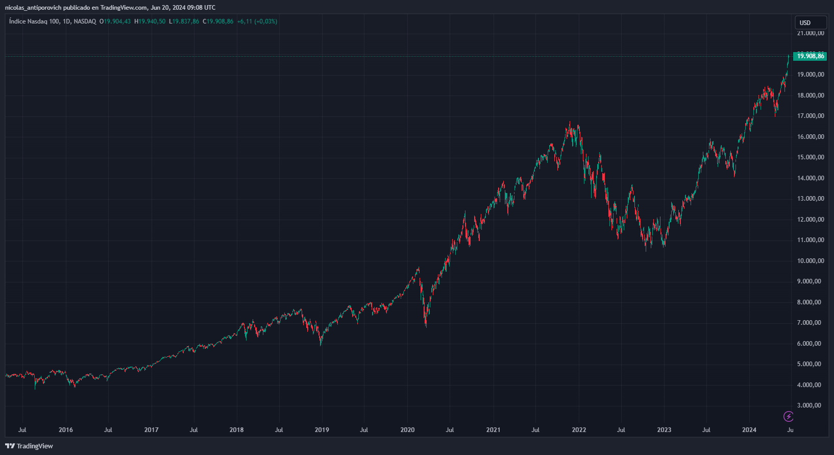 Llamativamente, mientras bitcoin está manteniendo su lateralización, el índice bursátil NASDAQ (con el que bitcoin suele estar muy correlacionado) está marcando máximos históricos al momento de esta publicación, tal como puede verse en el siguiente gráfico de TradingView: