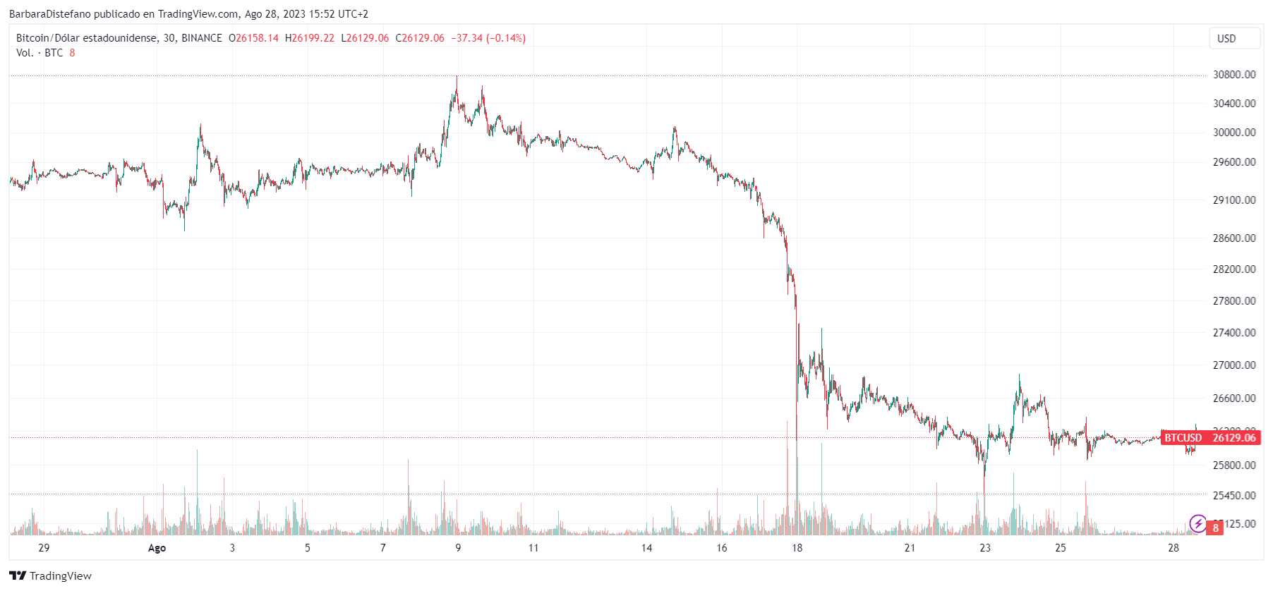 Bitcoin (BTC) inicia su segunda semana cotizando alrededor de USD 26.000, mostrando baja volatilidad de precio luego del retroceso que experimentó hasta este nivel.