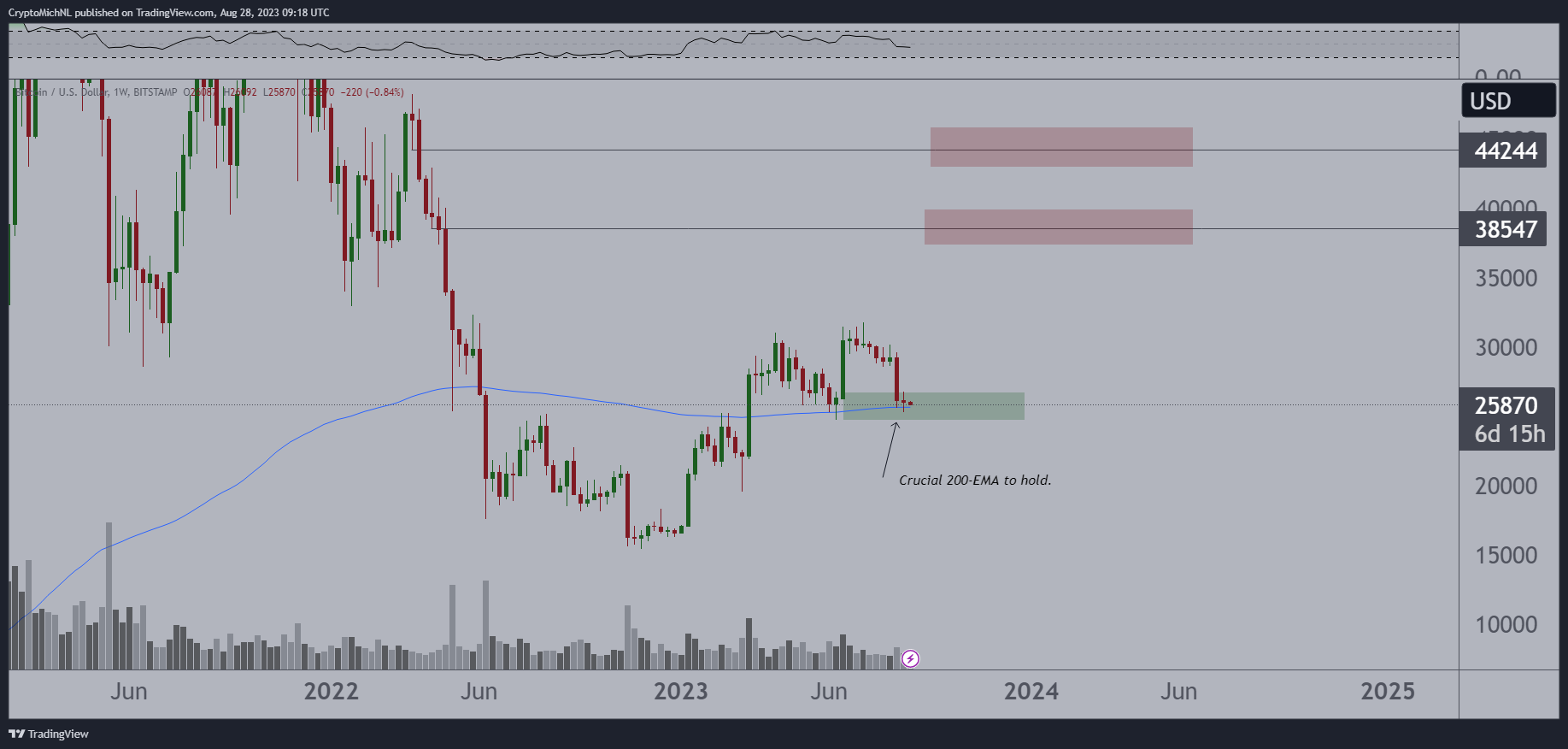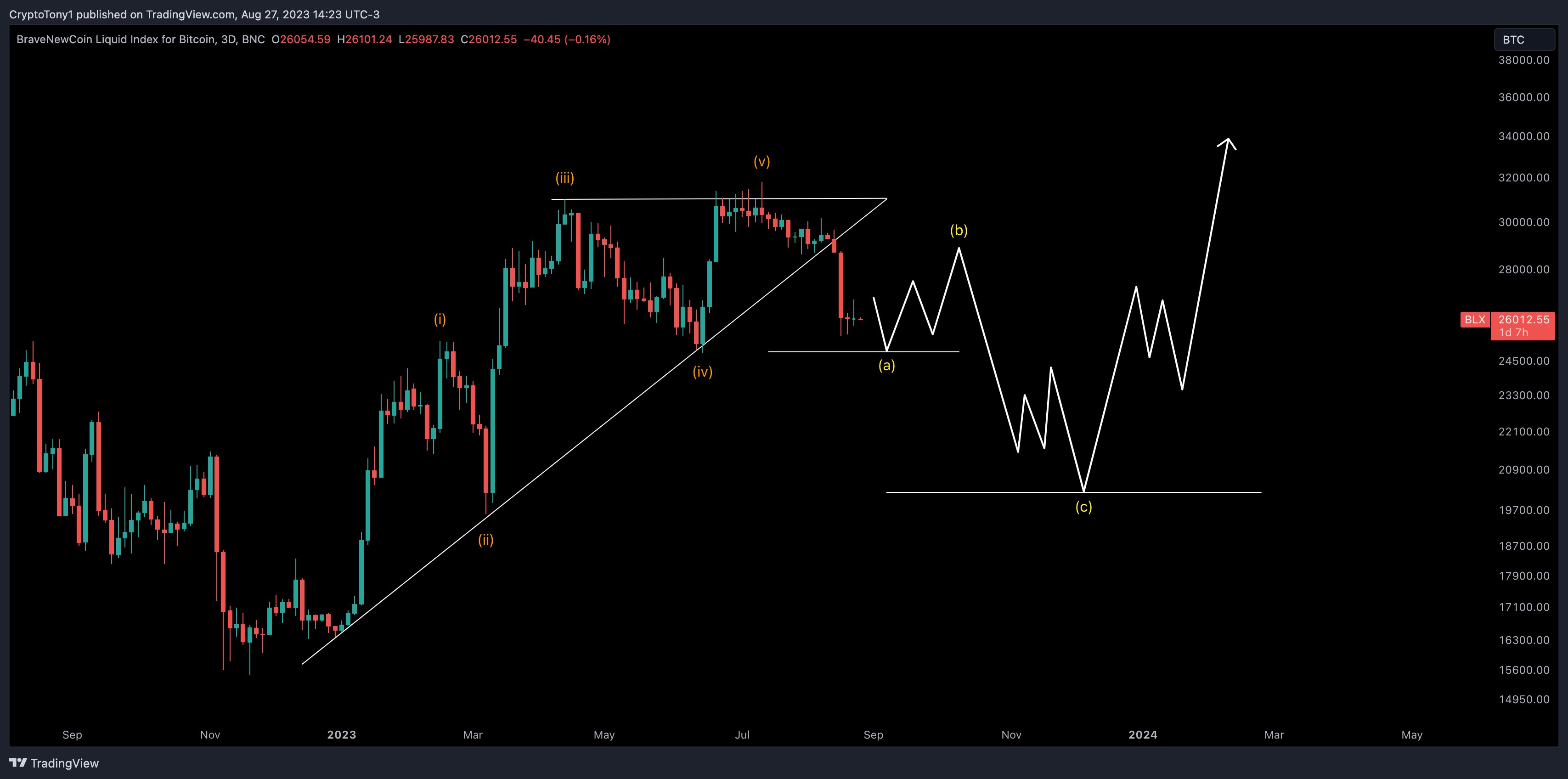 Con esto en mente, Crypto Tony prevé, como el escenario más negativo de van de Poppe, que bitcoin caiga hasta el nivel psicológico de USD 20.000 antes de que termine el año y comience a subir de cara a 2024 a un nuevo máximo.