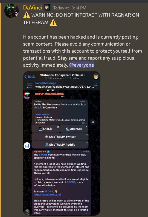 El administrador del Discord de Shiba Inu, DaVinci, emitió un mensaje en la plataforma, advirtiendo a la comunidad que no interactuaran con Ragnar a través de Telegram, tras ser hackeado.