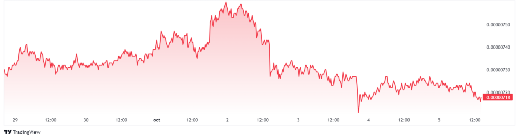 El precio de SHIB pasó de estar en USD 0,0000730 el pasado jueves a USD 0,00000718 actualmente.