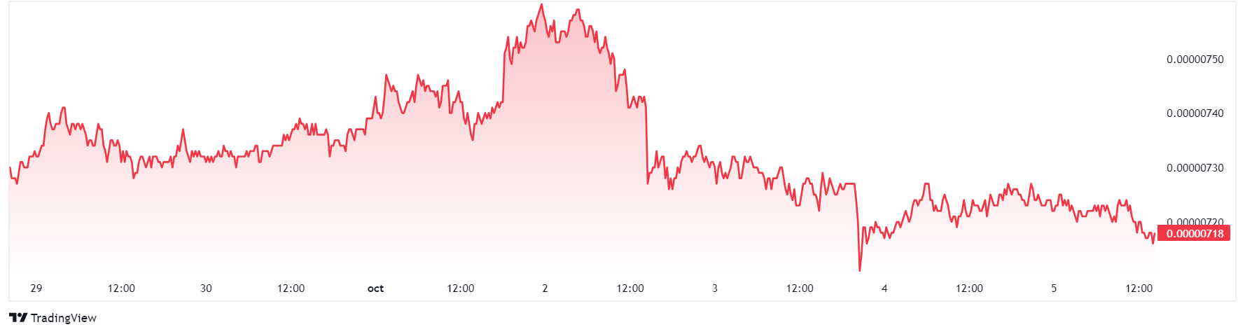 A pesar de la gravedad de lo ocurrido, el precio de Shiba Inu no se vio afectado especialmente en las últimas horas, aunque sí enfrentó una semana bajista, como se puede ver el siguiente gráfico de TradingView.
