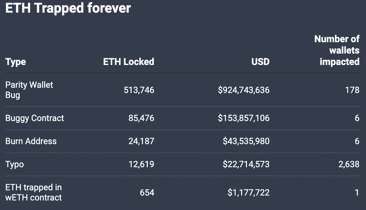 Grogan categorizó miles de instancias de errores tipográficos de Ethereum al enviar transacciones, errores de usuarios y contratos inteligentes defectuosos para llegar a esta conclusión. El analista señaló que la cifra de 600.000 ETH es una estimación conservadora, ya que no incluye pérdidas por claves privadas extraviadas.
