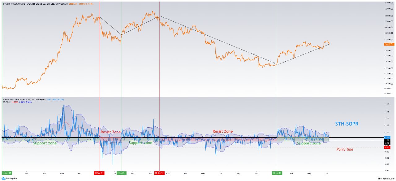El indicador STH-SOPR significa Short Term Holders (tenedores de corto plazo, en español) y se enfoca solo en los inversionistas que han comprado bitcoin en los últimos 6 meses.