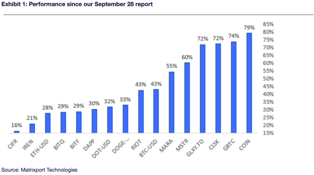 Además de las acciones de empresas de la industria, otros instrumentos tradicionales de exposición a la moneda digital también se fueron al alza. Por ejemplo, el fondo de inversión de bitcoin “GBTC”, de Grayscale, con una subida del 74%. Así se puede ver en el siguiente gráfico proporcionado por la empresa de inversiones y análisis Matrixport.
