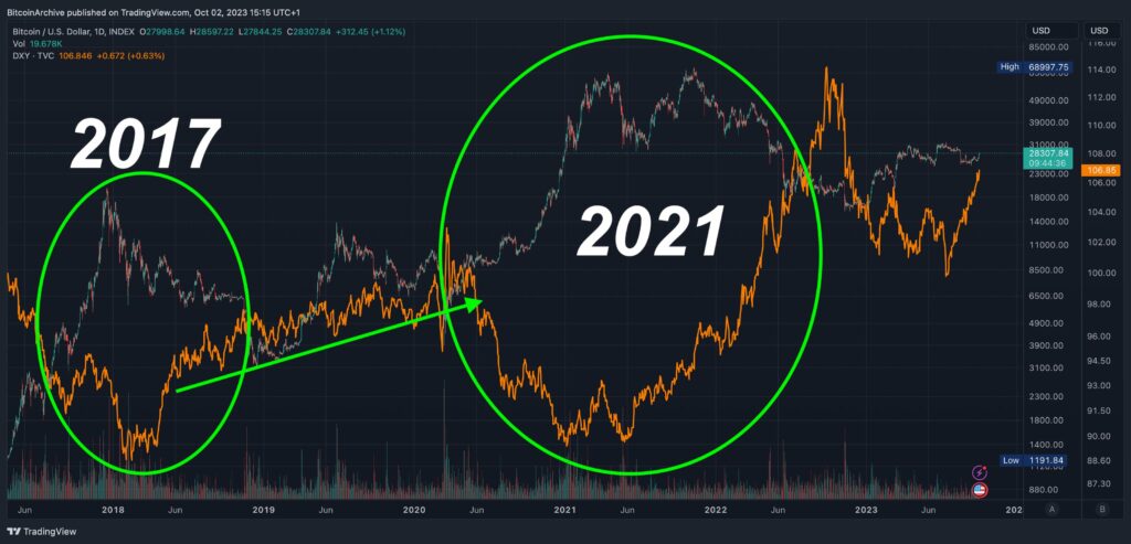 De todos modos, cabe tener en cuenta que incluso si el valor del dólar siguiera subiendo, “no significa automáticamente debilidad para bitcoin”. Así lo indicó el portal de contenido sobre el ecosistema Bitcoin Archive, según datos históricos.