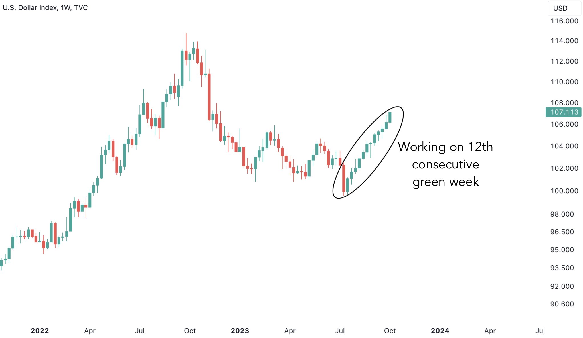 Este movimiento llevó a que el dólar se apreciara un 7,5% desde mediados de julio. Desde entonces, el DXY subió de 100, su mínimo puntaje en más de un año, a arriba de 107, su máximo nivel en 2023.