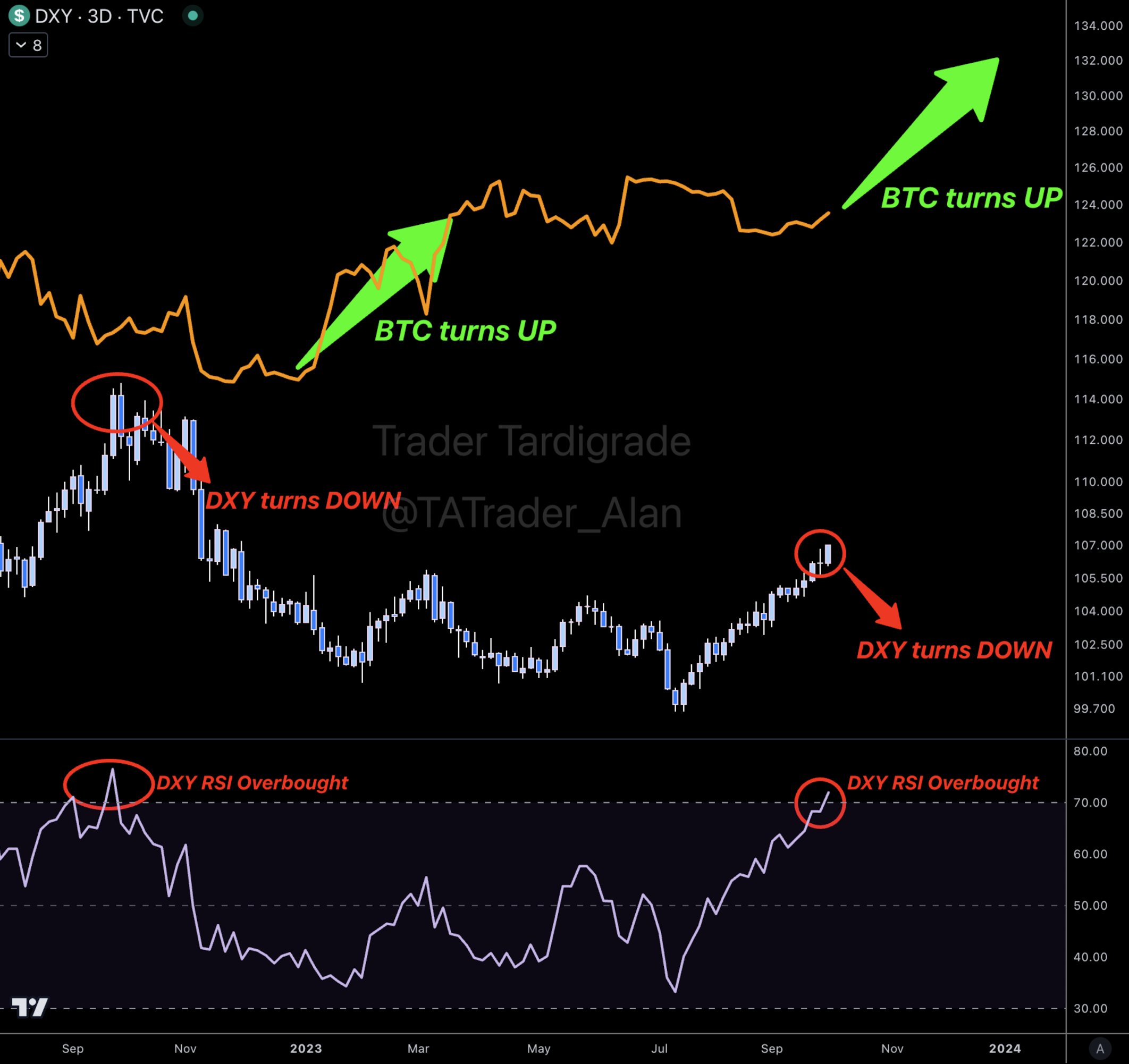 El analista de mercados de seudónimo “Trader Tardigrade” resaltó que el RSI, el índice de fuerza relativa que mide el impulso de los movimientos de precio de un activo financiero, en este caso del DXY, ha vuelto a subir a la zona de sobrecompra. La última vez que ocurrió eso fue a fines de 2022 y dio como resultado que el valor del dólar comience a bajar.