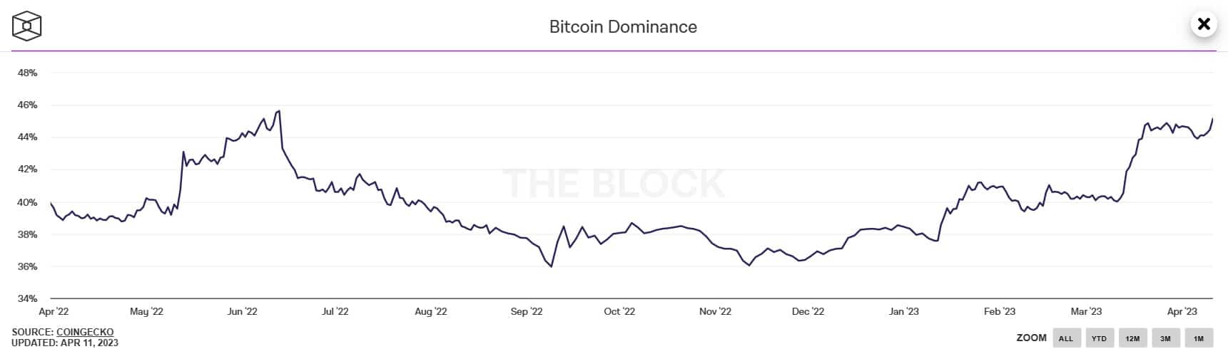 Al momento de esta redacción, The Block indica que la capitalización del mercado de bitcoin acapara el 45,16% del mercado de criptomonedas. Este porcentaje es su máximo desde junio de 2022 cuando había llegado a 45,63%, lo que refleja que la dominancia de BTC se está fortaleciendo en el mercado.