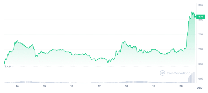 Al momento de esta publicación, cada unidad de LINK cotiza a USD 8,10. Su incremento en las últimas 24 horas fue de 18% y en la última semana de 26%.