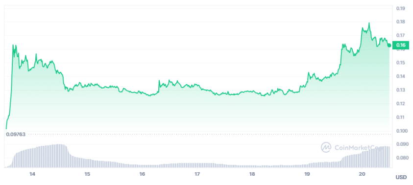 En las últimas 24 horas el precio de XLM se incrementó 15% y, en los últimos 7 (ver gráfico a continuación) días, el alza fue de 66%: