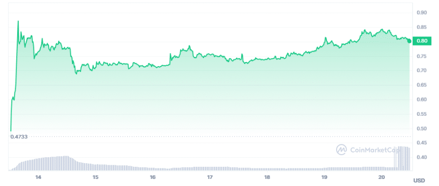 La apreciación semanal de XRP es superior al 69%. En el preciso momento de esta redacción, cada unidad de XRP cotiza a USD 0,80, pero llegó a comerciarse por USD 0,84 horas atrás, tal como se observa en el siguiente gráfico de precios: