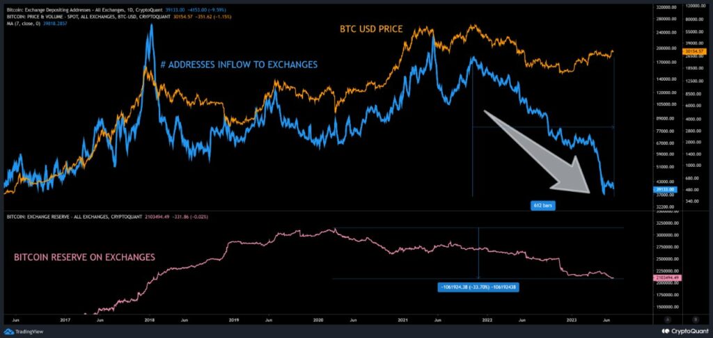 Adicionalmente, la firma de análisis CryptoQuant asegura que hay una caída en las reservas de bitcoin en los exchanges y no solo en los nuevos depósitos. “Desde marzo de 2020, las reservas de bitcoin en los intercambios cayeron más del 30%. Este es otro récord, en duración y profundidad”, indica CryptoQuant.