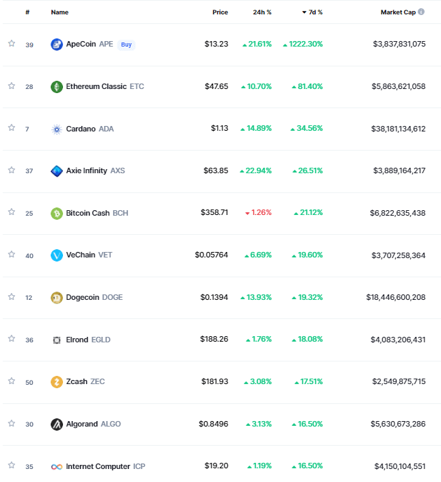 La lista de las más ganadoras en ese rango de tiempo es encabezada por una cara nueva pero a la vez familiar: ApeCoin (APE), token recién estrenado, pero que es parte del proyecto de coleccionables o token no fungibles (NFT) Bored Ape Yacht Club. Recién estrenada, esta moneda ha subido más de 1.000% en siete días y se ubica actualmente en el puesto 39 del mercado según capitalización, con más de 3.800 millones de dólares en total.