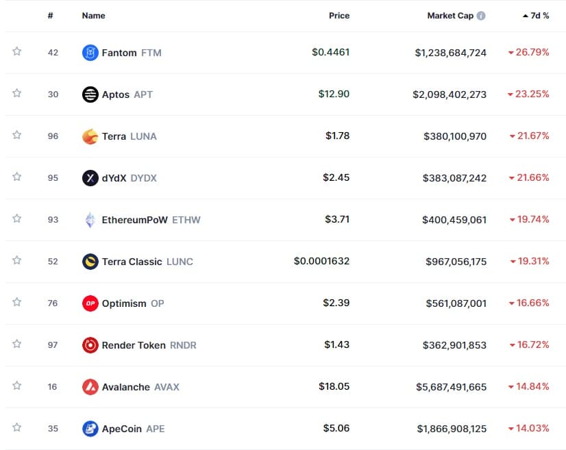 La más perjudicada en ese rango es Fantom (FTM), que ha caído un 26,79% según los registros de CoinMarketCap. Le siguen otras tres criptomonedas con más de 20% de depreciación. Se trata de Terra (LUNA), DYDX y, llamativamente, una de las más ganadoras de lo que va de año: Aptos (APT), con un bajón de 23%. Esta APT ha subido más de 300% este año, y ha sido la mayor ganadora del top 50 de las criptomonedas más valiosas.