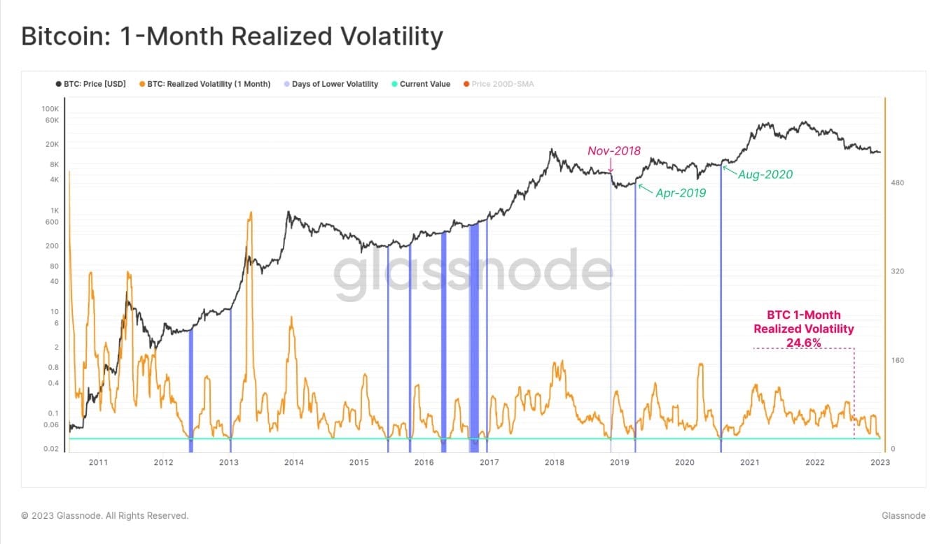 De acuerdo con Glassnode, una de las firmas de análisis de blockchain, la volatilidad de BTC de 1 mes llegó a mínimos extremos de solo 24,6%. Estos niveles bajos se han observado solo en “pocas ocasiones” en los 14 años de vida de bitcoin.