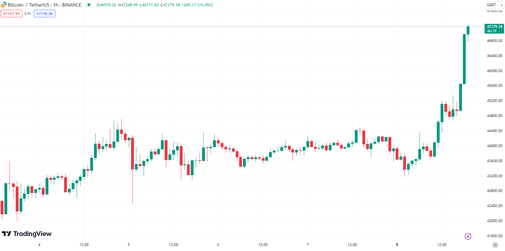 La noticia fue bien recibida por el mercado que llevó a la moneda digital a superar la marca de 45.880 dólares alcanzada el 2 de enero. De esta manera, bitcoin alcanzó hoy, 8 de enero, precios que no se veían desde abril de 2022, tal como se aprecia en el siguiente gráfico de TradingView: