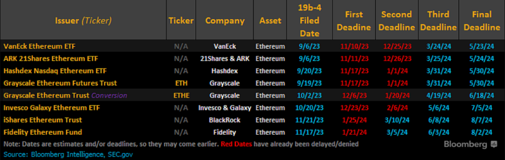 No obstante, hay una fecha anterior que es clave para su aprobación y esa es el 23 de mayo, como se ve en el próximo cuadro. En esta vence el plazo final de evaluación de la primera propuesta de ETF de ether presentada por la empresa VanEck.