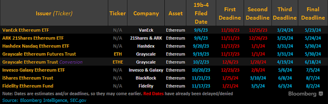 No obstante, hay una fecha anterior que es clave para su aprobación y esa es el 23 de mayo, como se ve en el próximo cuadro. En esta vence el plazo final de evaluación de la primera propuesta de ETF de ether presentada por la empresa VanEck.