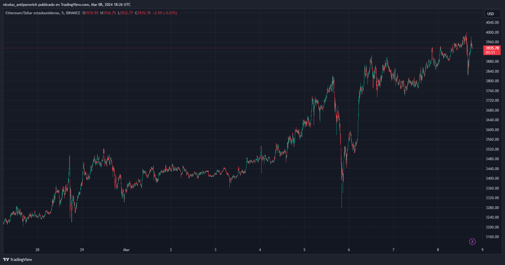 Ether (ETH), criptomoneda de la red Ethereum, ha llegado a los 4.000 dólares en varios exchanges durante la jornada actual, una marca de precio que no se veía desde enero de 2022.