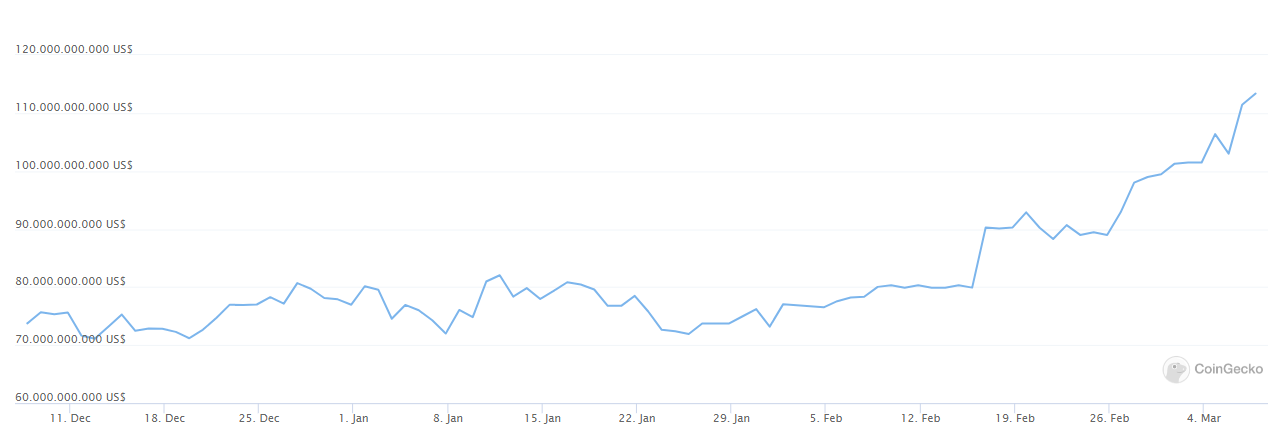 Una muestra de ello, es que los tokens asociados a protocolos DeFi han logrado restablecer su capitalización, aumentando de 74.500 millones de dólares a principios de año a 114.000 millones de dólares en la actualidad, un crecimiento notable del 53% en solo tres meses, como se aprecia en el siguiente gráfico.