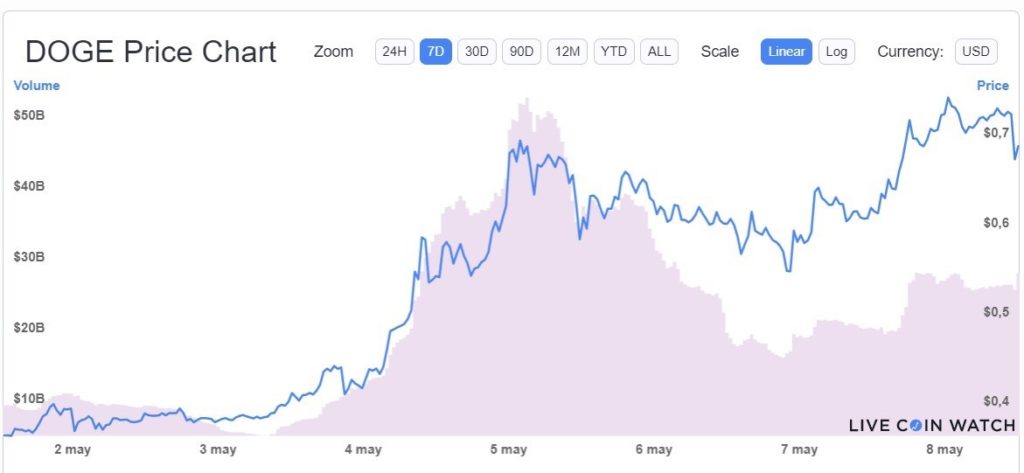 En promedio Dogecoin se apreció alrededor de 100% en estos siete días. Su valor osciló entre los USD 0,374 y USD 0,728, un pico al que llegó este 8 de mayo.