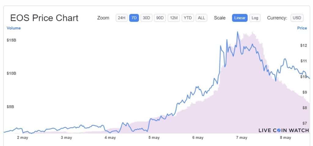 Entre tanto, el precio de EOS ganó hasta un 53% en la semana. En los últimos 7 días osciló entre un mínimo de USD 6,38 el 2 de mayo y un pico de USD 12,81 este sábado 8.