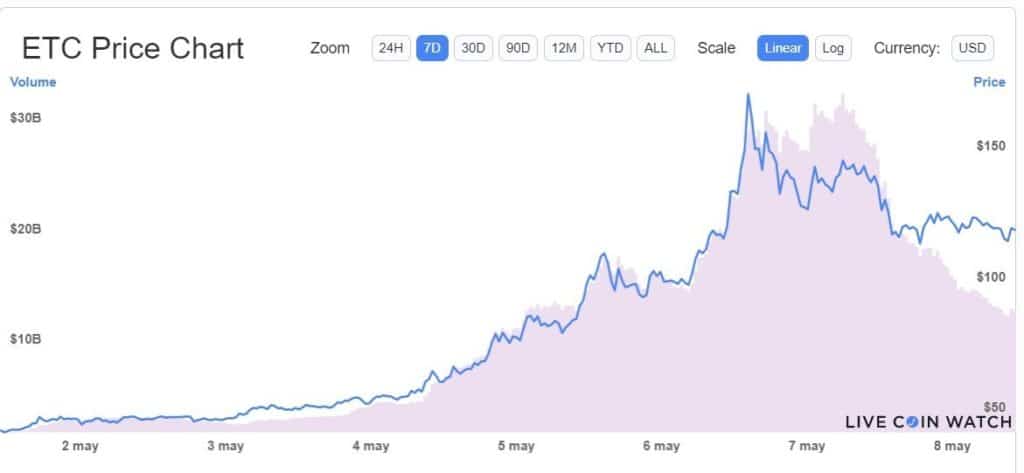 Luego de que el pasado 17 de abril Ethereum Classic (ETC) superara el máximo histórico (ATH) alcanzado hace 3 años, cotizándose por encima de USD 40, esta semana superó con creces esa cifra. Para el 6 de mayo se cotizó en un máximo de USD 168, un valor que representa más del 400% de su ATH del 3 de febrero de 2018 (de USD 38,9).