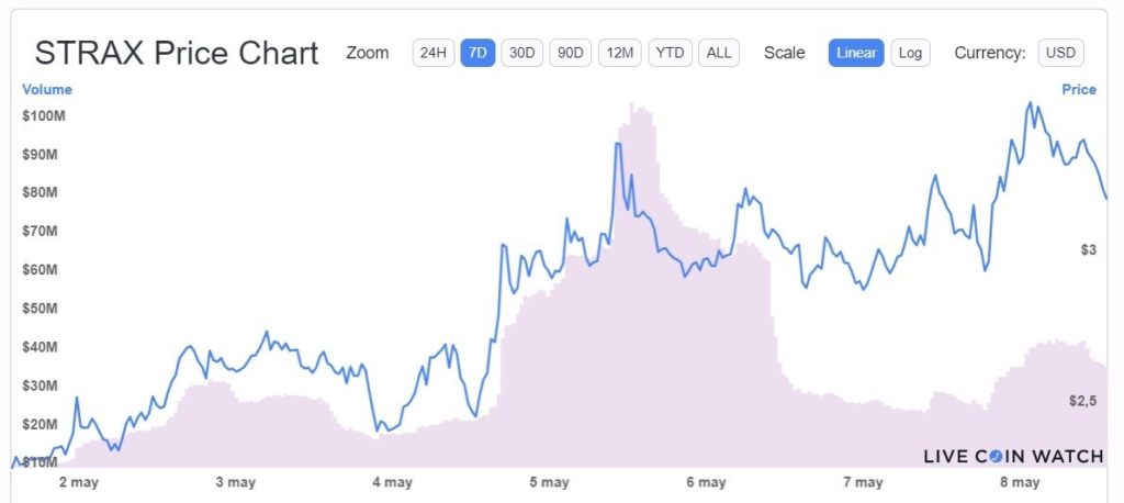 En el marco del anuncio, la criptomoneda STRAX, que se coloca en el top de este medio por segunda semana consecutiva, comenzó a subir de precio desde el 4 de mayo. Llegó a un máximo de USD 3,48 este sábado 8.