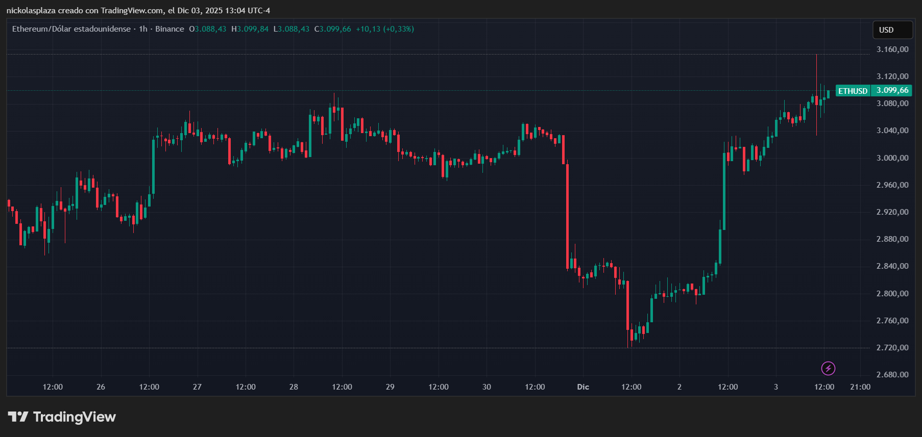 El ascenso del criptoactivo se da desde un precio de 2.712 dólares registrado ayer, 2 de diciembre, hasta cotizar en 3.099 dólares, durante la jornada actual, como se aprecia en el gráfico.