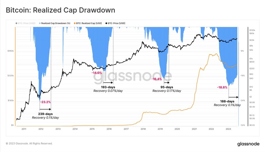 En ese sentido, y partiendo de que el mercado bajista del 2022 ya terminó, “la recuperación de la capitalización realizada de bitcoin hasta ahora se ha producido a un ritmo similar”, según Glassnode.