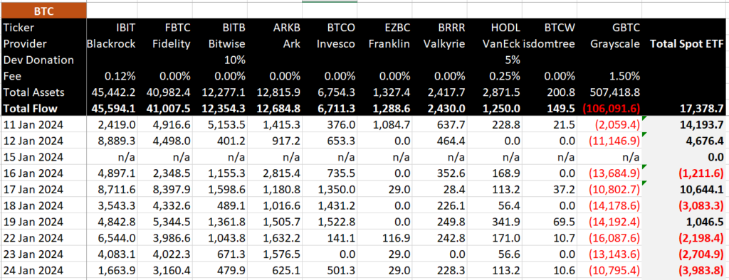 En los nueve días que lleva en la bolsa, ha percibido salidas de casi 4.400 millones de dólares (USD). Esto lo ha obligado a deshacerse de más de 100.000 bitcoins (BTC), tal como se ve en la siguiente tabla proporcionada por la firma de datos BitMEX Research.