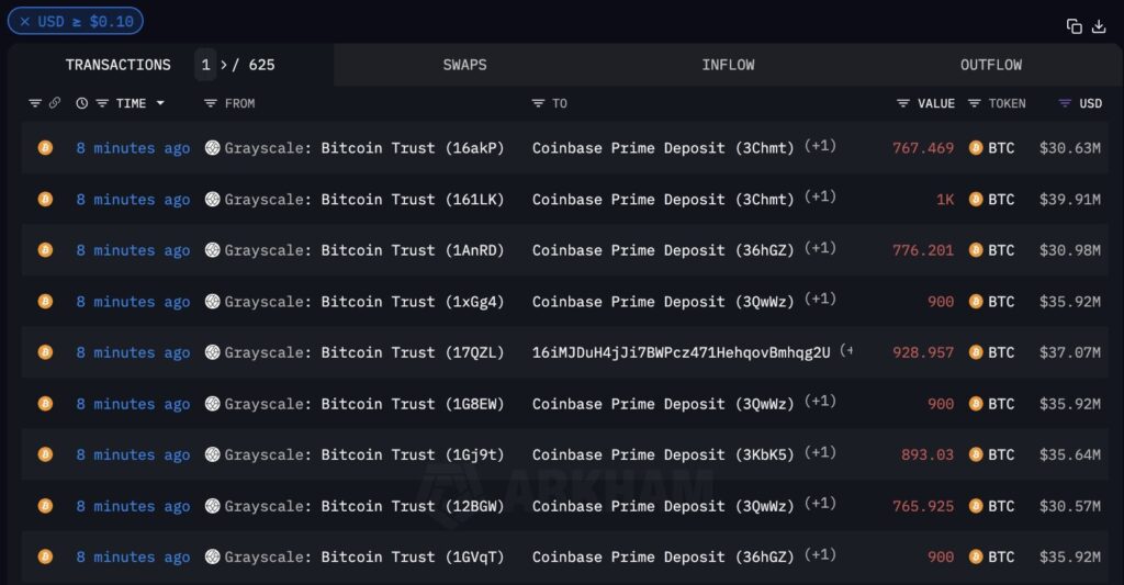 Con esta masiva venta, GBTC pasó de tener alrededor de 600.000 a 500.000 bitcoins en apenas nueve días. Y parece que seguirá disminuyendo la cantidad, dado que hoy transfirió otros 10.000 BTC al exchange Coinbase Prime, según datos en cadena detectados por la firma de investigación Arkham exhibidos a continuación.