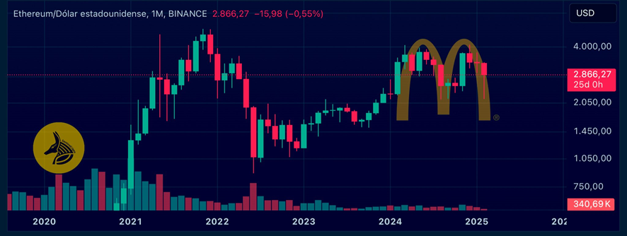 Por su parte, el analista de mercado Santino Cripto tiene una opinión distinta a la de Eric Trump, y resalta que el análisis técnico no arroja buenas señales. Según explicó, la cotización de ether ha formado un “patrón Mc Donalds”.