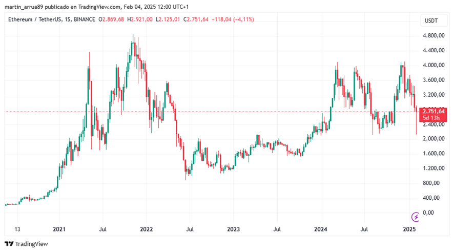 Al momento de la publicación de esta nota, la cotización de ETH es de 2.750 dólares, 43% por debajo de su máximo histórico (ATH) de 4.890 dólares, alcanzado en noviembre de 2021.