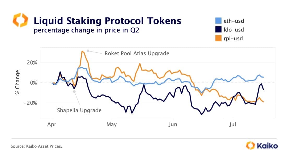 Con la activación de la actualización Shapella en abril, el precio de RPL experimentó un alza de más del 20%. De este modo, mostró mayores ganancias que LDO e incluso que la criptomoneda de Ethereum, ether (ETH). Sin embargo, esta tendencia al alza cambió luego.