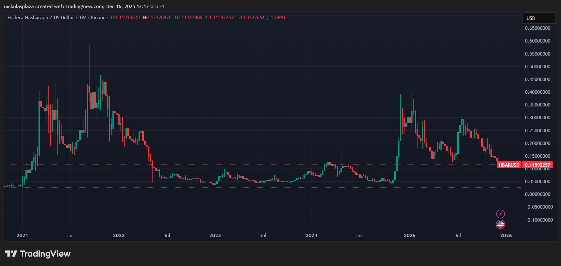 Este descenso la ha llevado a alcanzar su nivel más bajo desde noviembre de 2024, con el siguiente soporte clave ubicado en 0,10 dólares. HBAR cotiza actualmente un 80% por debajo de su máximo histórico alcanzado en 2021.