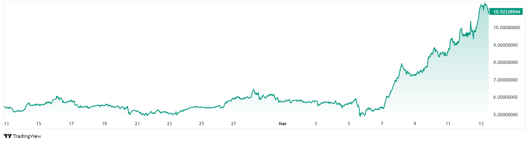 Este crecimiento ha llevado a RUNE, que hace apenas siete días se cotizaba a 5 dólares, a alcanzar los 11 dólares en la jornada actual, convirtiéndose así en la criptomoneda con la mayor subida en la última semana, como se ve en el siguiente gráfico de TradingView.