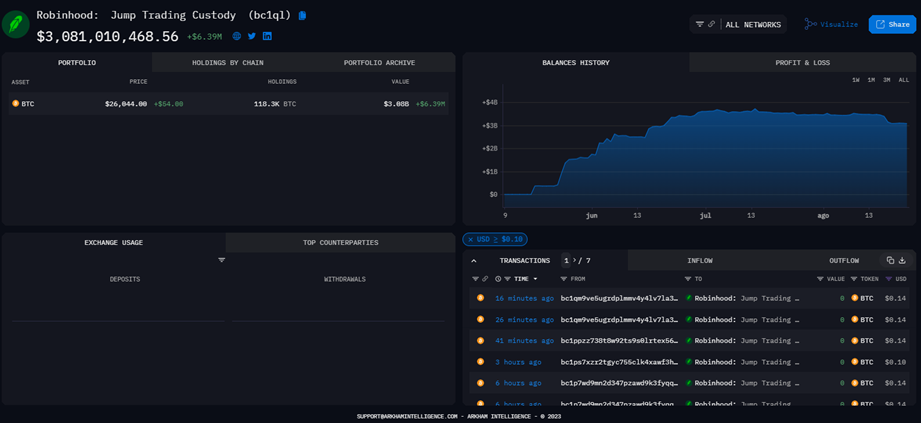De acuerdo con datos proporcionados por Arkham Intelligence, una plataforma de rastreo de fondos de Bitcoin, la dirección bc1q…59v2 pertenece a Robinhood Markets Inc., una empresa financiera que desde 2018 ofrece servicios para la compra y venta de criptomonedas.