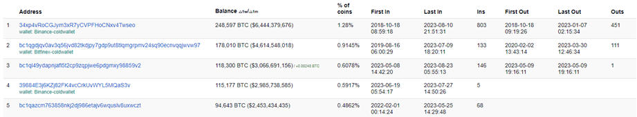 Desde el pasado 8 de mayo, una dirección de Bitcoin comenzó a acumular saldo hasta alcanzar la cifra de 118.300 BTC, al momento de redactar esta nota. En la actualidad, esta ballena de Bitcoin se posiciona como la tercera dirección con más BTC.