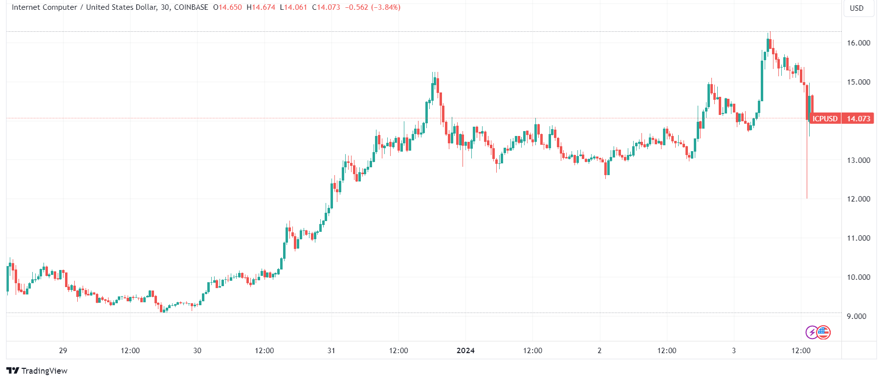 Aunque tuvo una breve caída en la jornada actual, como se puede apreciar en el siguiente gráfico de TradingView (producto del descenso en el precio de bitcoin (BTC) de 45.200 a 42.700 dólares), ICP parece que está logrando recuperarse.