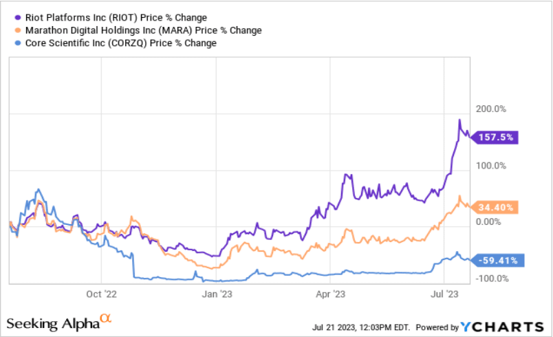 Sobre la alta capacidad de producción de Riot, el rendimiento en 12 meses ha sido mejor en comparación al de otras compañías del mismo rubro como Marathon Digital Holdings. Esto se debe a la diferencia en los modelos de minería: una utiliza “proveedores de alojamiento de terceros para la infraestructura, mientras que Riot es una empresa integrada verticalmente”, dice el análisis.