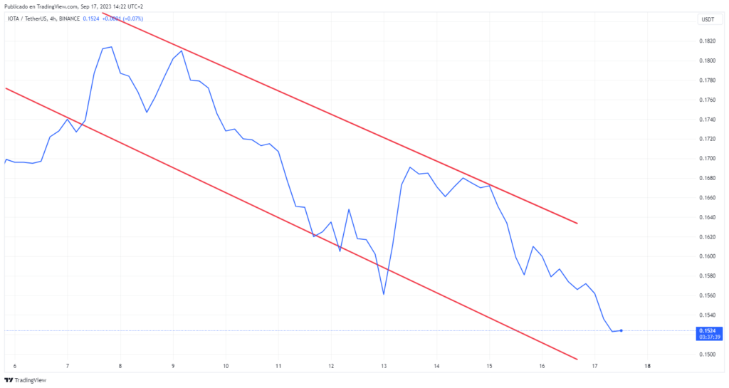 En el siguiente gráfico elaborado con herramientas de TradingView se aprecia que, aunque tuvo algunas correcciones al alza, IOTA se comportó toda la semana con una tendencia evidentemente bajista (con mínimos y máximos locales más bajos que los anteriores).