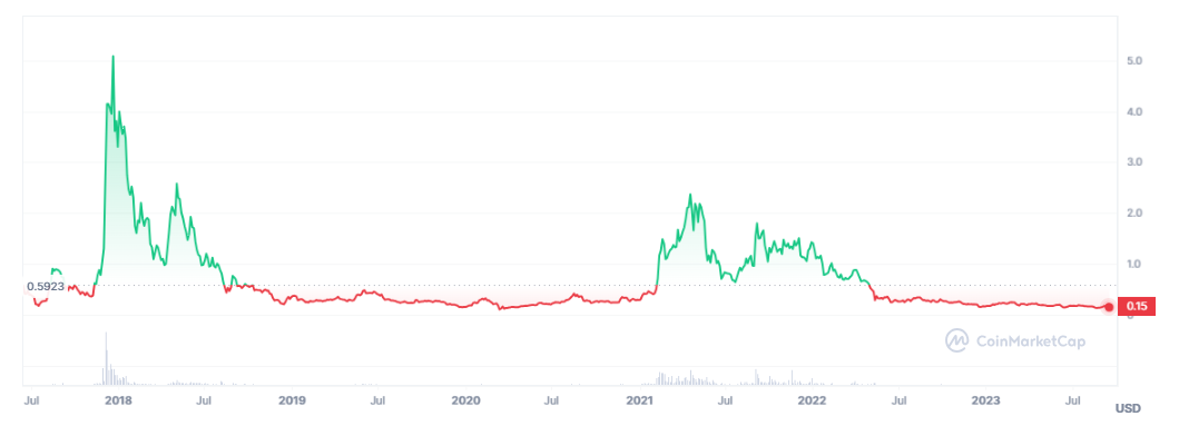 La criptomoneda se puso de moda en 2017, y muchos la consideraban un «bitcoin killer» (asesino de bitcoin). Llegó a estar en el top 10 del ranking por capitalización de mercado. Pero, después del furor inicial y de haber superado la marca de USD 5, IOTA jamás pudo alcanzar nuevos máximos históricos, ni siquiera en el ciclo alcista de 2020-2021, cuando la mayoría de los activos digitales rompieron sus propias marcas previas.