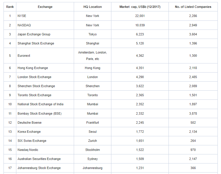 ASX, la más grande de ellas, representa una de las veinte bolsas bursátiles más operadas del mundo y conforman la 16º bolsa con mayor capitalización bursátil alcanzando los 1.200 billones de dólares. En el siguiente cuadro comparativo, provisto por la plataforma financiera Real Banks, se aprecia la capitalización de las principales bolsas de valores.