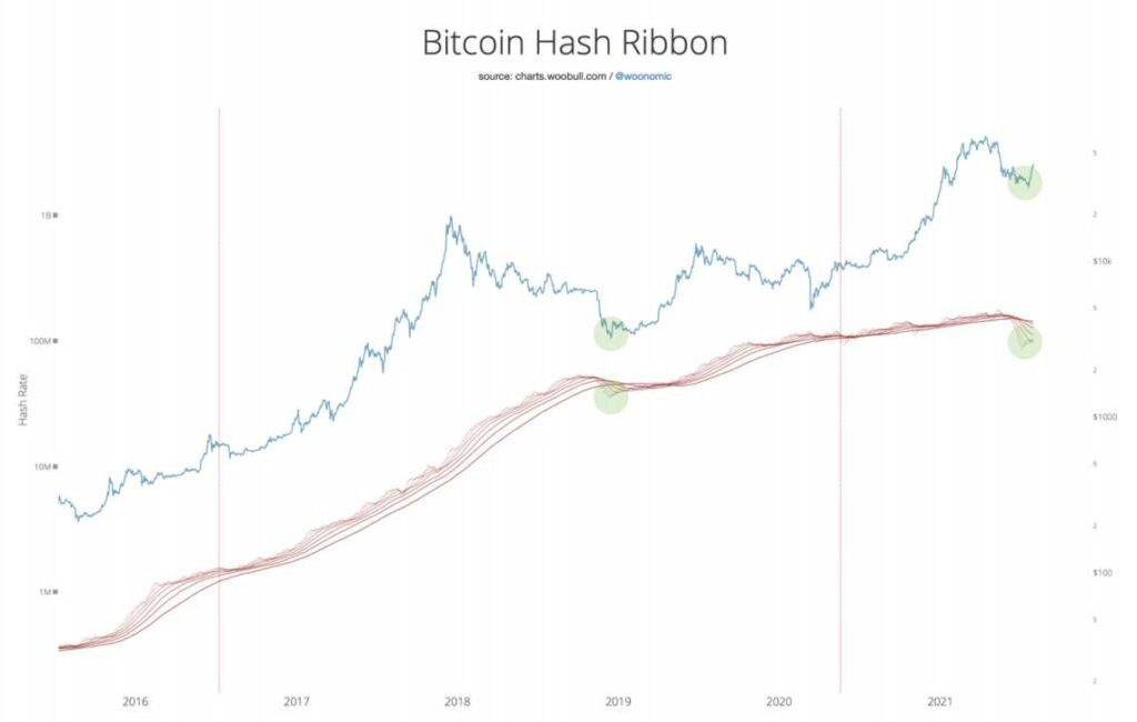 A través de la métrica de la cinta de hash (hash ribbon), se puede hacer seguimiento a la contracción y a la expansión del hash rate de la red, dice Woo. En el momento presente, señala el analista, estamos en una fase de recuperación de una capitulación de los mineros. Esta situación se produce cuando los mineros venden masivamente sus BTC porque la actividad deja de ser rentable. Woo se refiere a la histórica caída del hash rate por causa de las restricciones a los mineros en China.