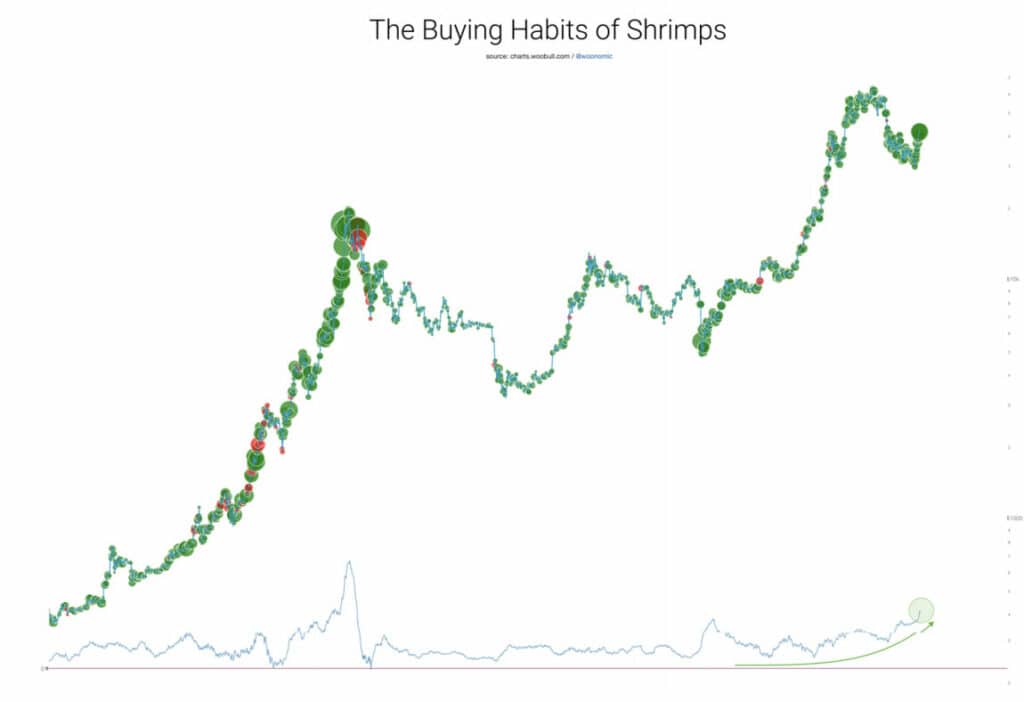 En la última semana ha habido compras fuertes de las ballenas, lo cual no es una señal definitivamente alcista por sí sola, acota el analista. Pero esta actitud de compra de las ballenas soporta la acción de precios alcista, ya que los camarones están comprando también, afirma Woo.