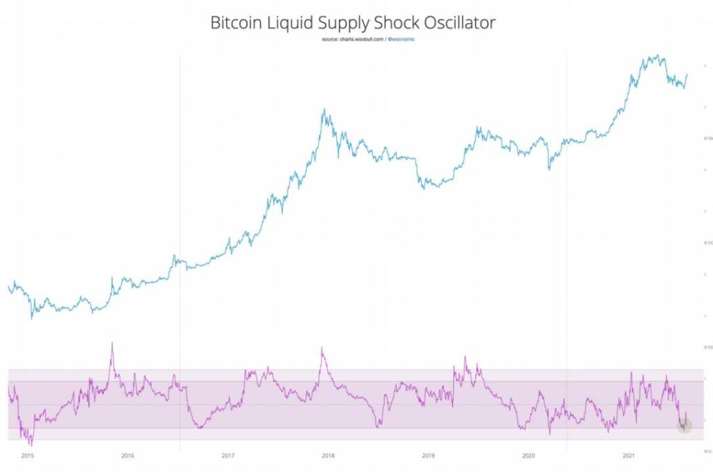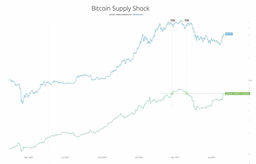 El indicador del shock del suministro se calcula dividiendo las monedas que no pueden ser compradas entre las que sí lo son, dice Woo. Se trata entonces del cociente de las monedas que está en manos fuertes, divididas entre las monedas que están en manos de los traders especulativos, según el analista. «Actualmente, la métrica del shock del suministro es consistente con un precio de USD 55.000», afirma Woo.